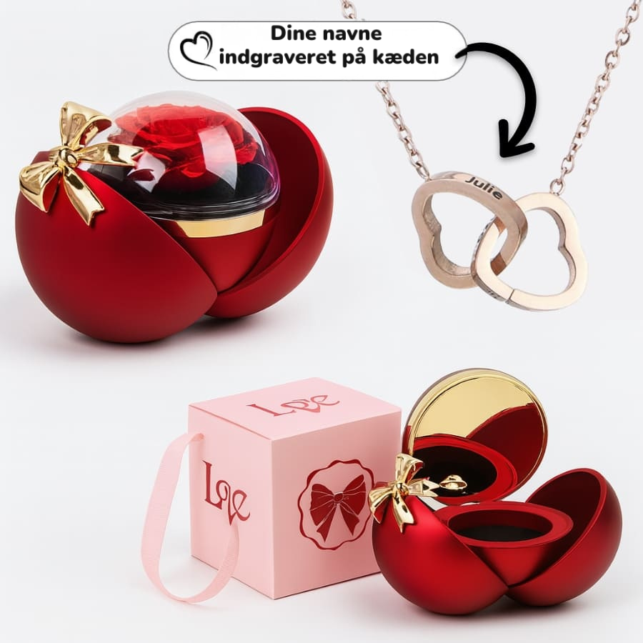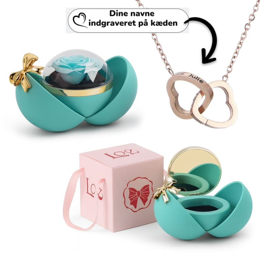Med denne evige rose og indgraverede dobbelte hjertehalskæde vil du altid have din kærlighed med dig. Når du åbner æsken, afsløres halskæden med jeres navne – fint indgraveret og færdiggjort i 18 karat ædle metaller, 14 karat hvidguld eller 14 karat rosaguld. Et unikt symbol på jeres bånd.