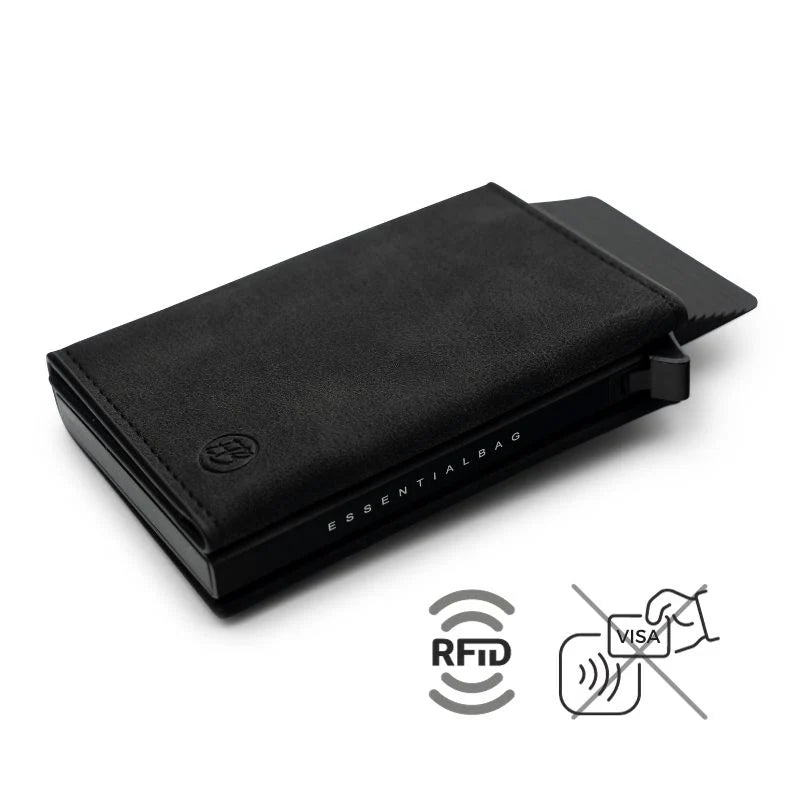 Aluminiumsrummet i den smarte tegnebog blokerer radiobølgerne fra RFID-læsere og forhindrer dermed uautoriseret aflæsning af data. Dette holder dine data sikre. Kortene er sikre og beskyttede.